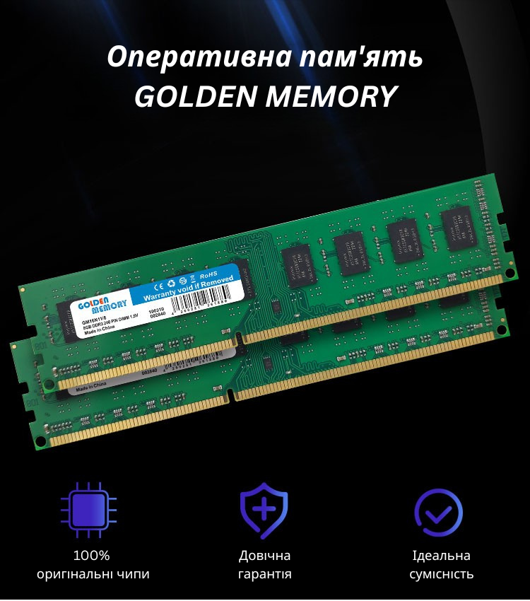 Модулі пам’яті GOLDEN MEMORY створені з використанням якісних компонентів, проходять перевірку на сумісність і надійність, що гарантує тривалий термін служби та стабільну продуктивність вашого ПК.